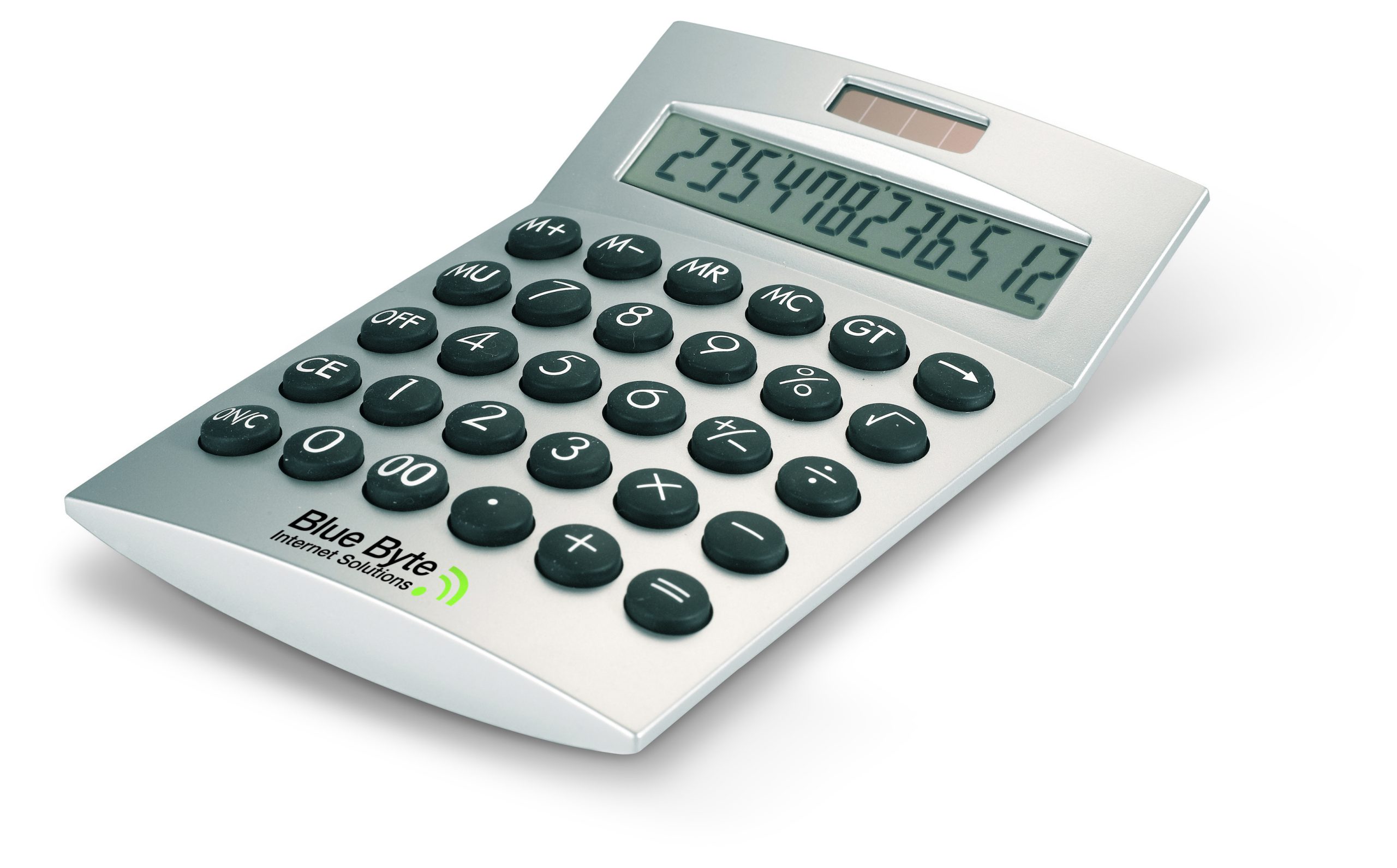 12 digit solar energy calculator with plastic housing. 1 cell battery included.
