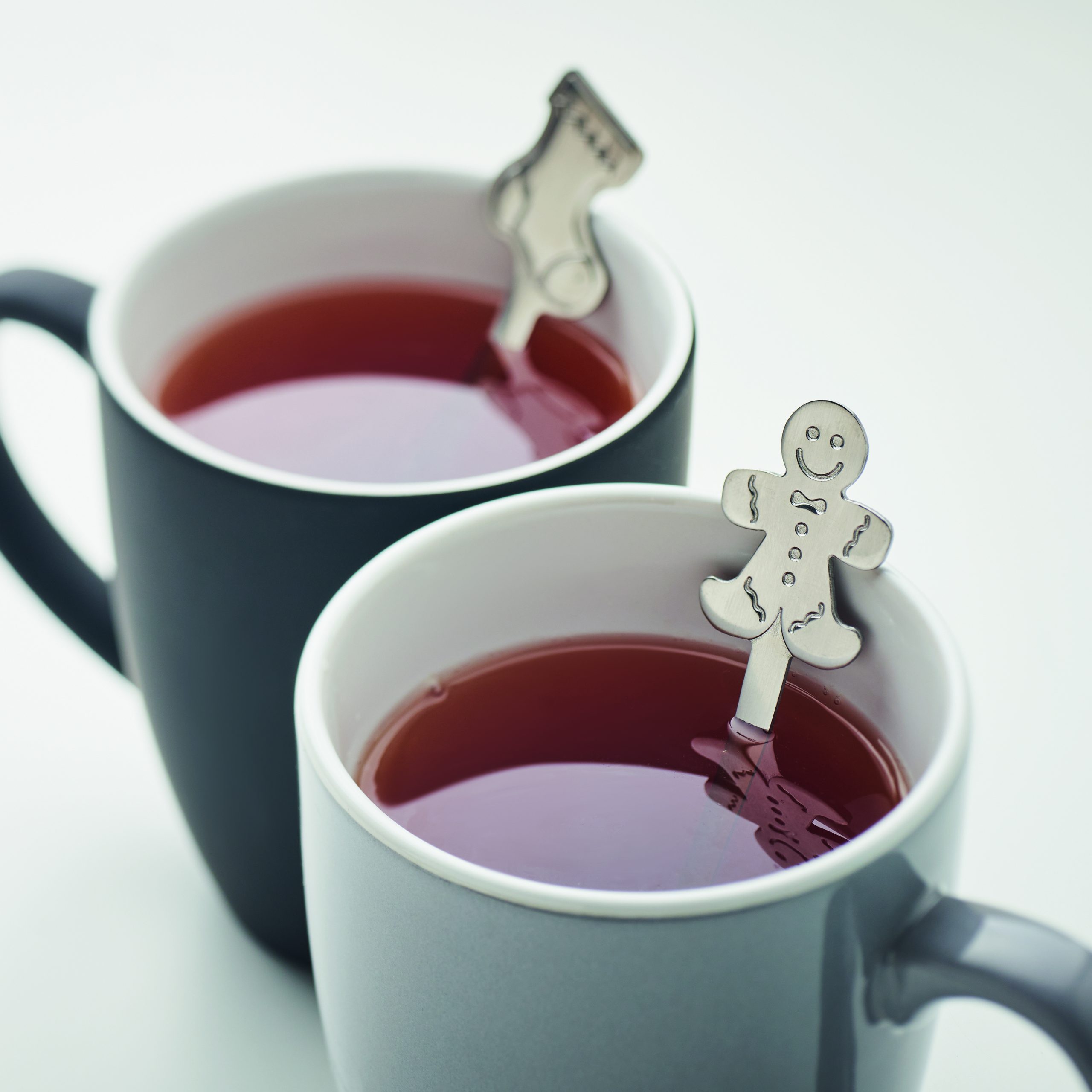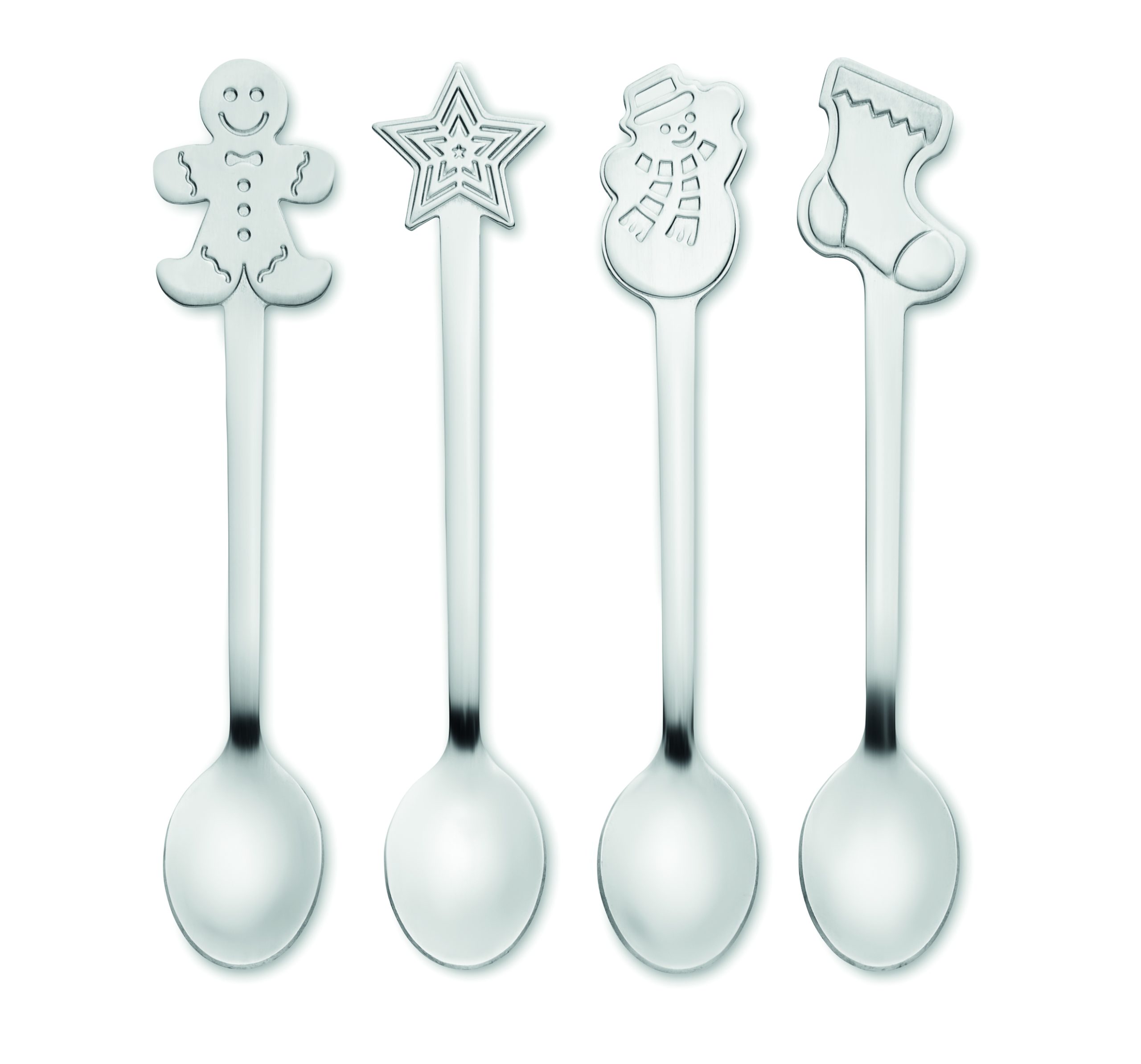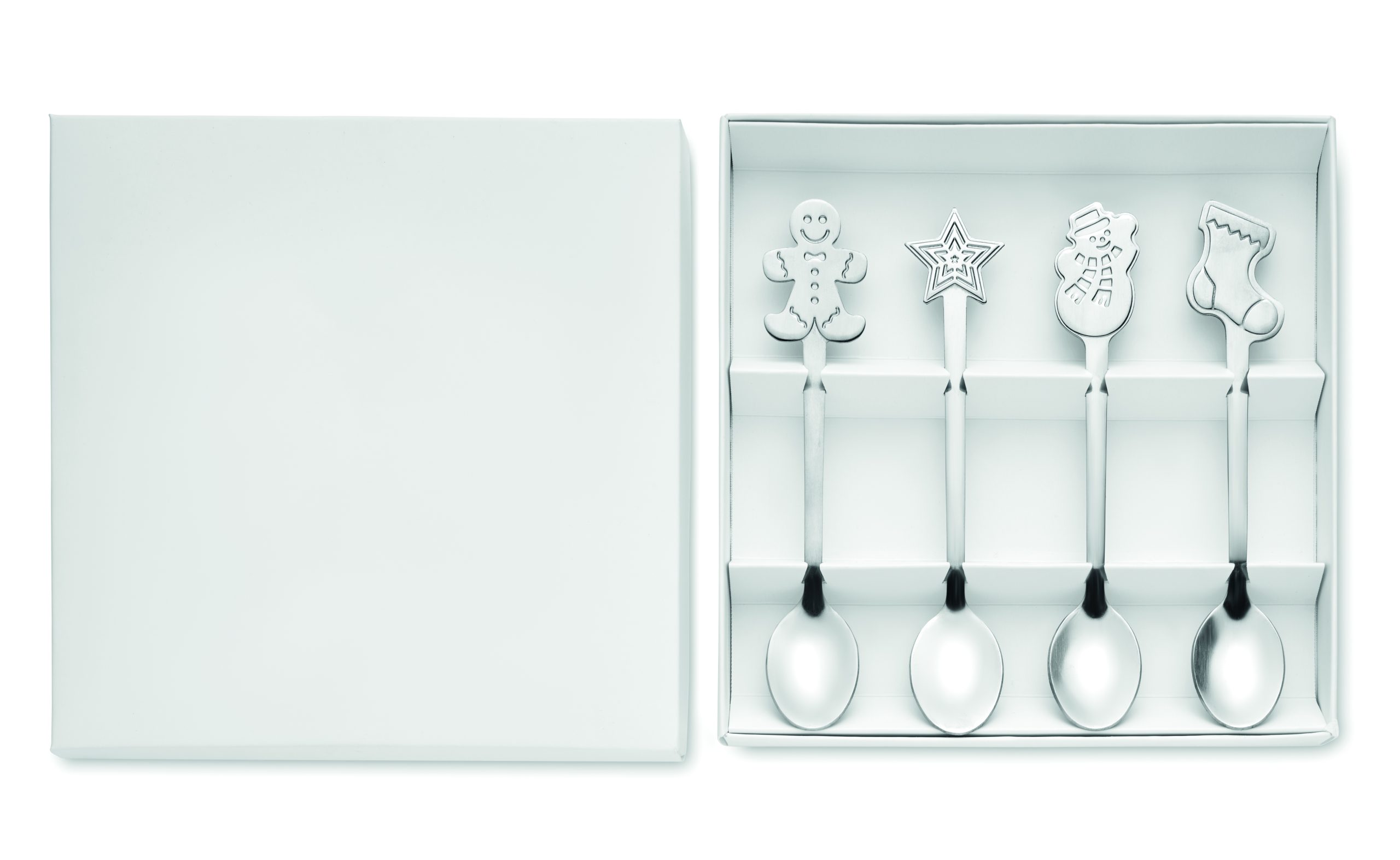 Set of 4 different stainless steel Christmas motif tea spoons. Presented in giftbox.