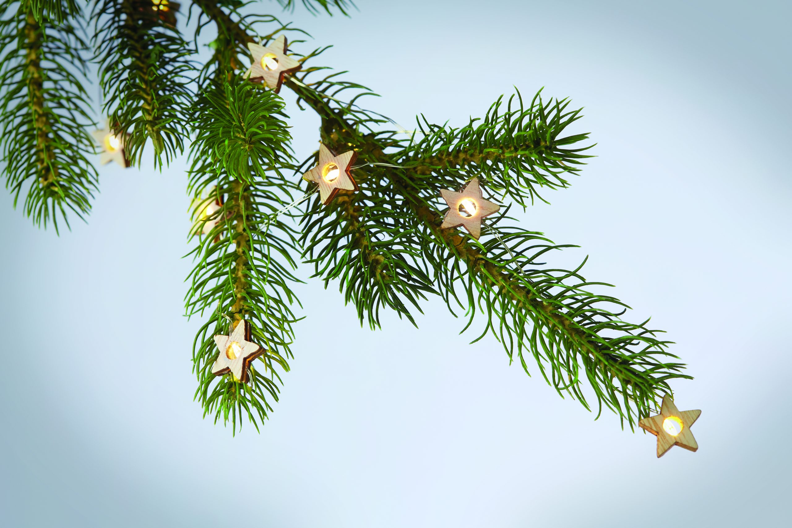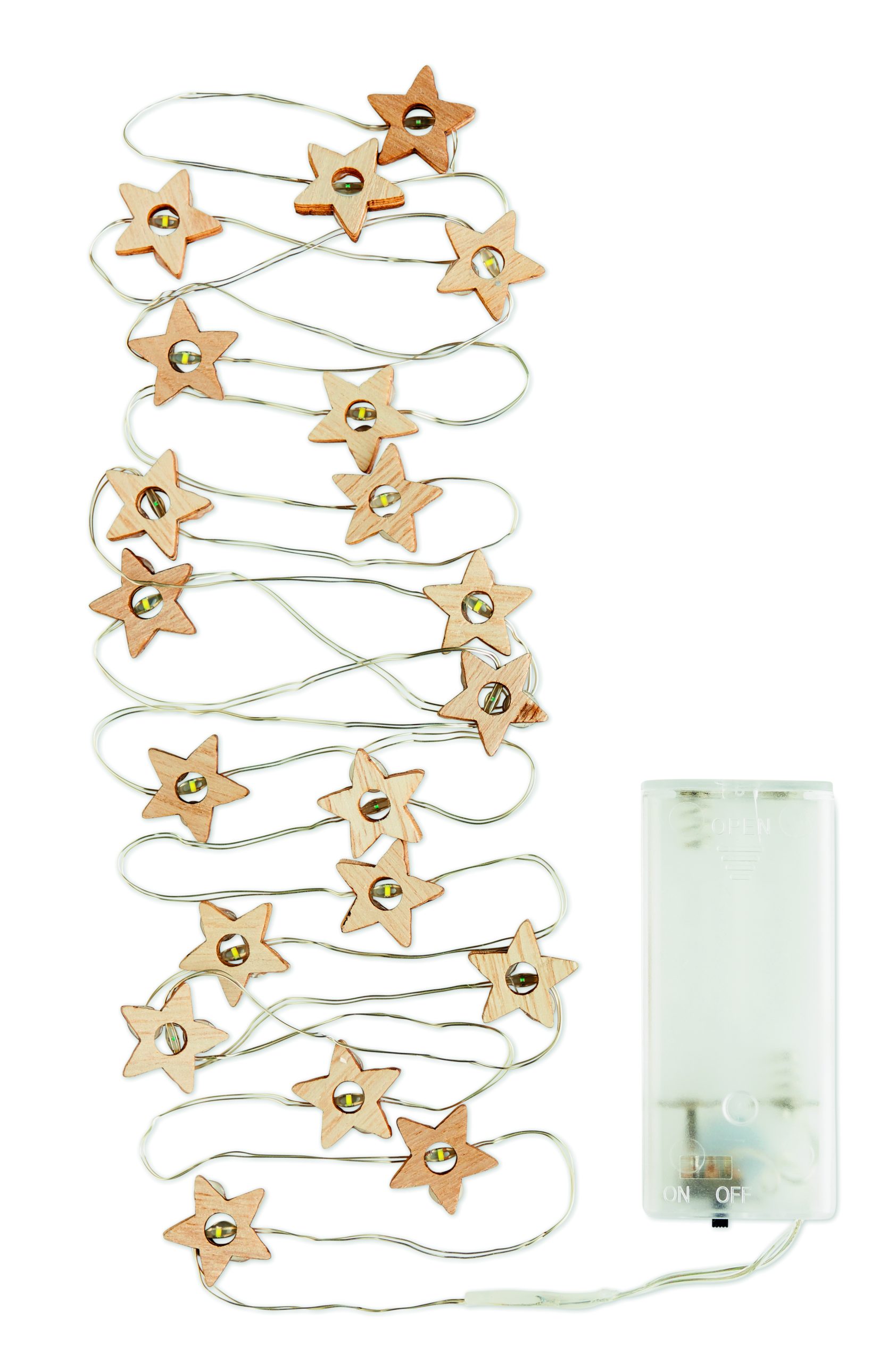String with 20 LED lights in wooden star shape. Presented in carton box. 2 AA batteries not included. On/off button in battery case.