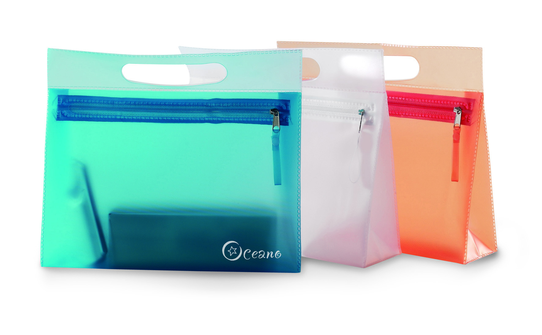 Transparent PVC cosmetic pouch with zipper.