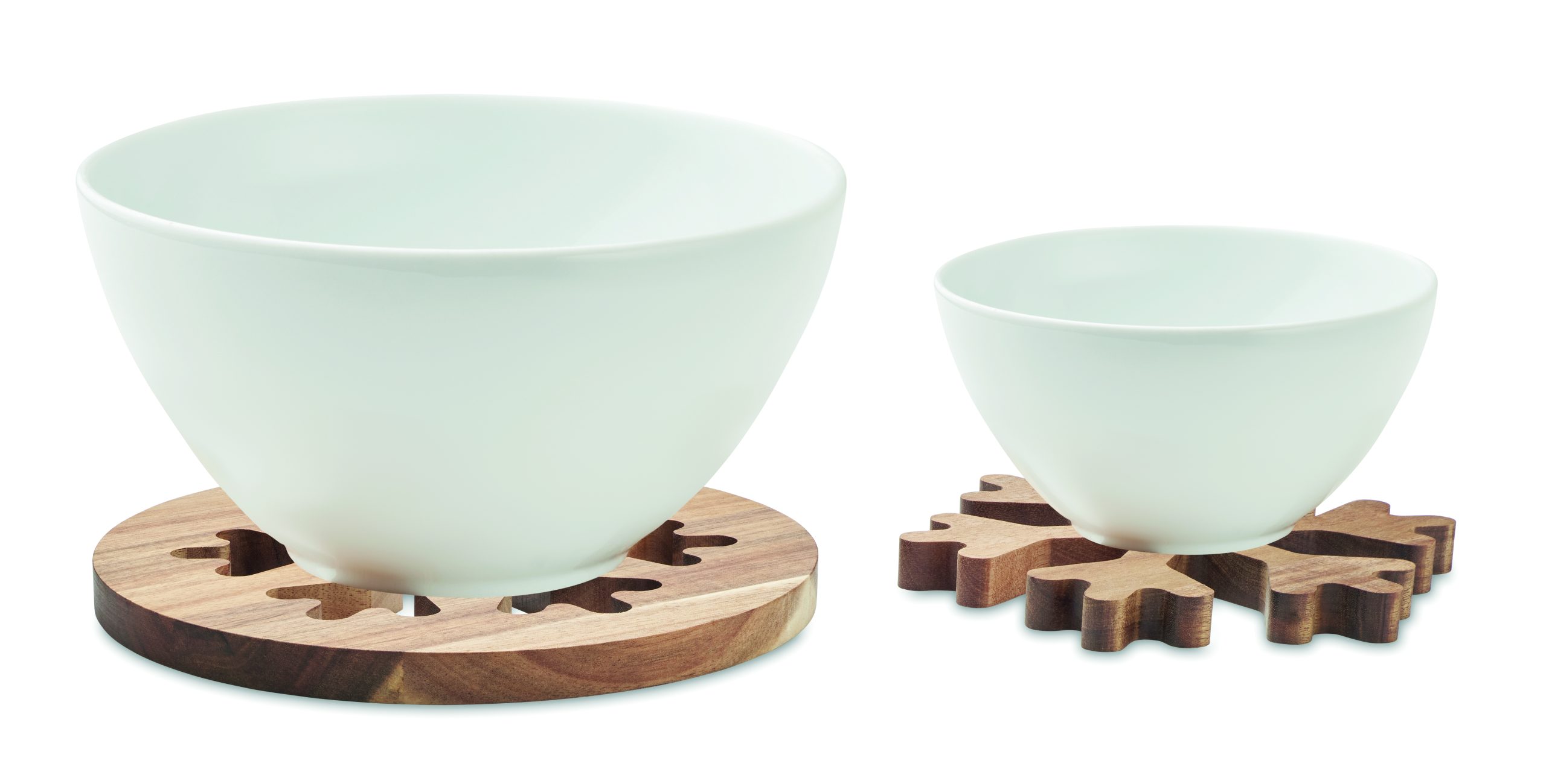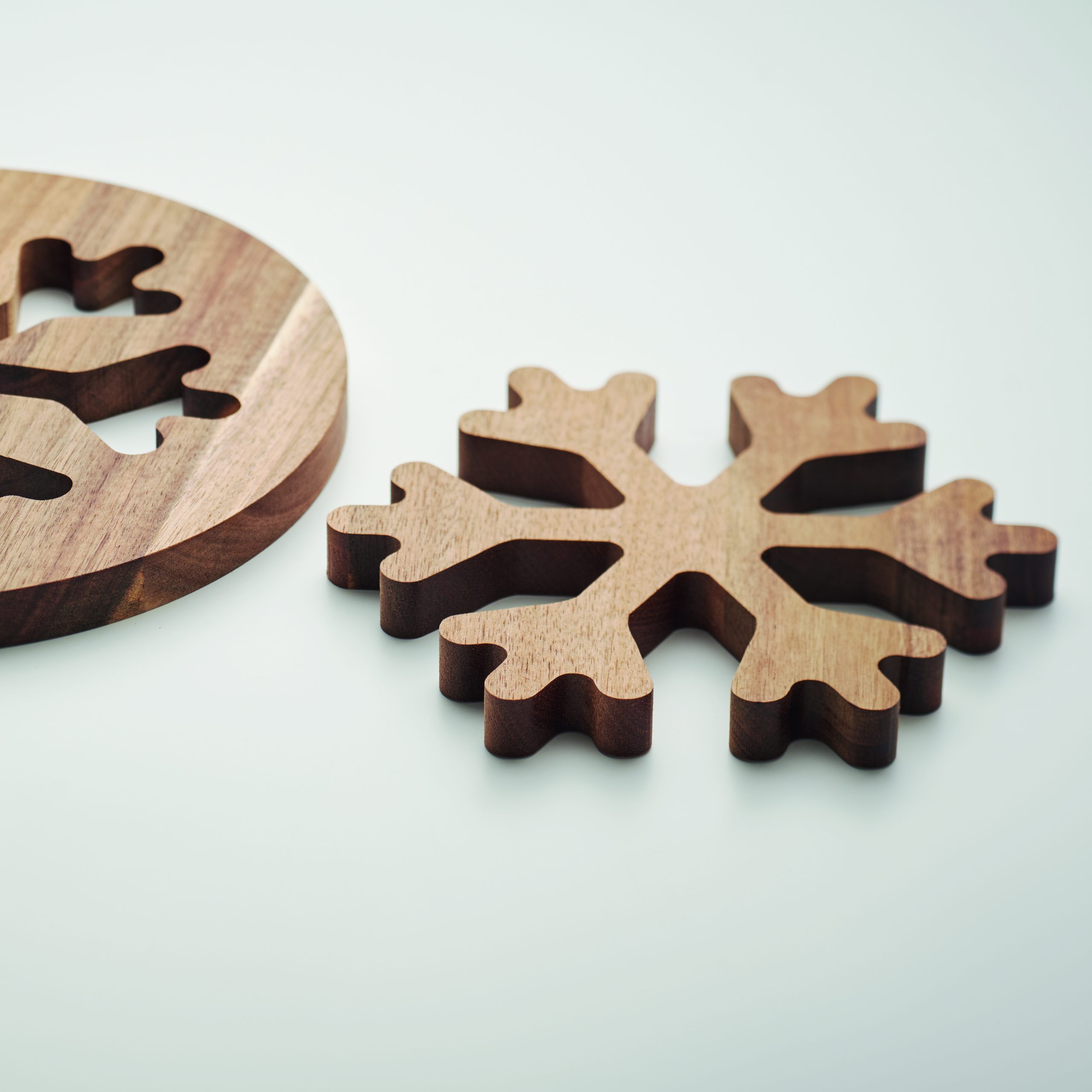 Set of 2 acacia wood pot holder with snowflake design. Wood is a natural product, there may be slight variations in colour and size per item, which can affect the final decoration outcome.