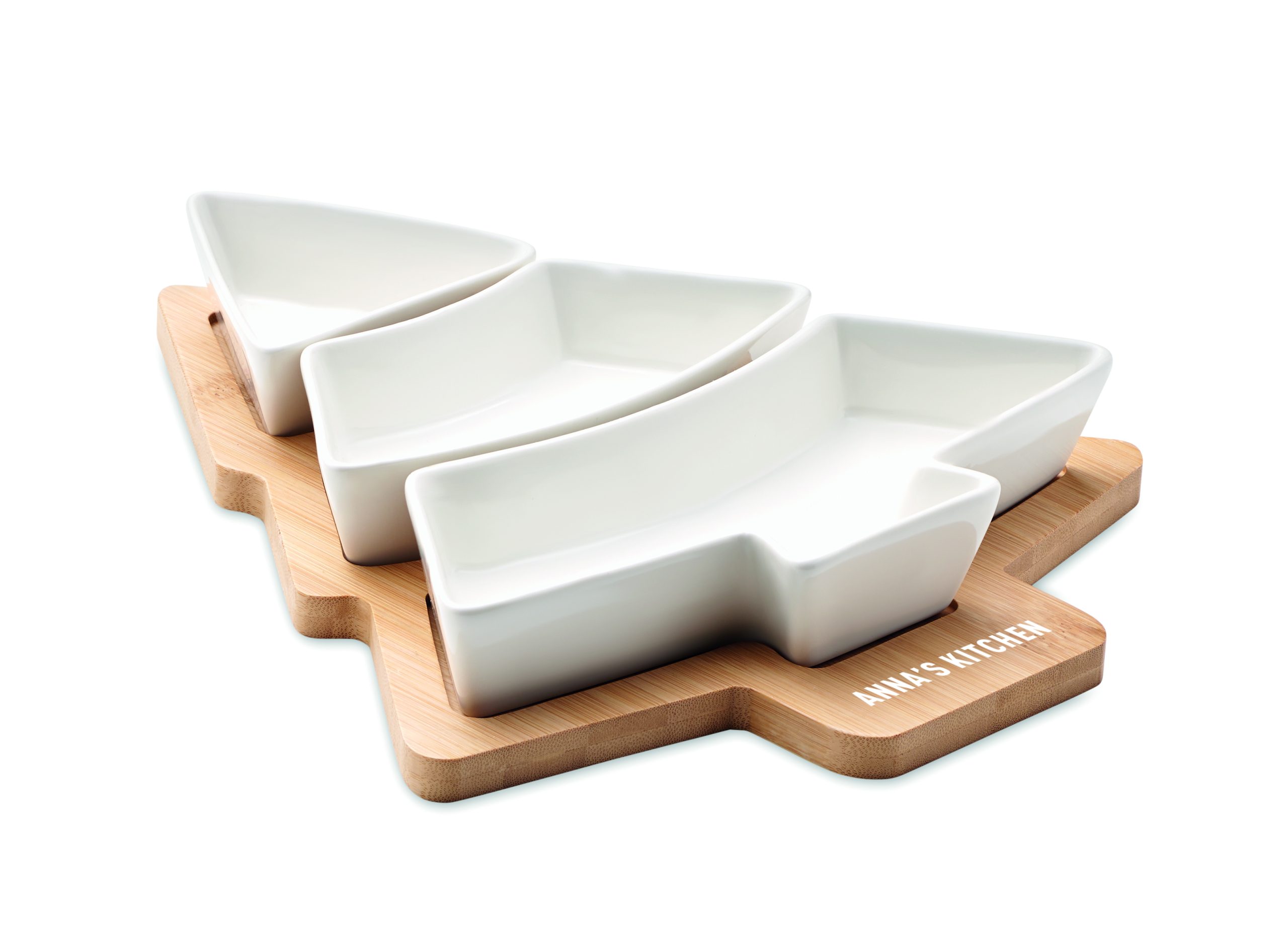 Tree-shaped bamboo serving platter with three ceramic serving dishes. Bamboo is a natural product, there may be slight variations in colour and size per item, which can affect the final decoration outcome.