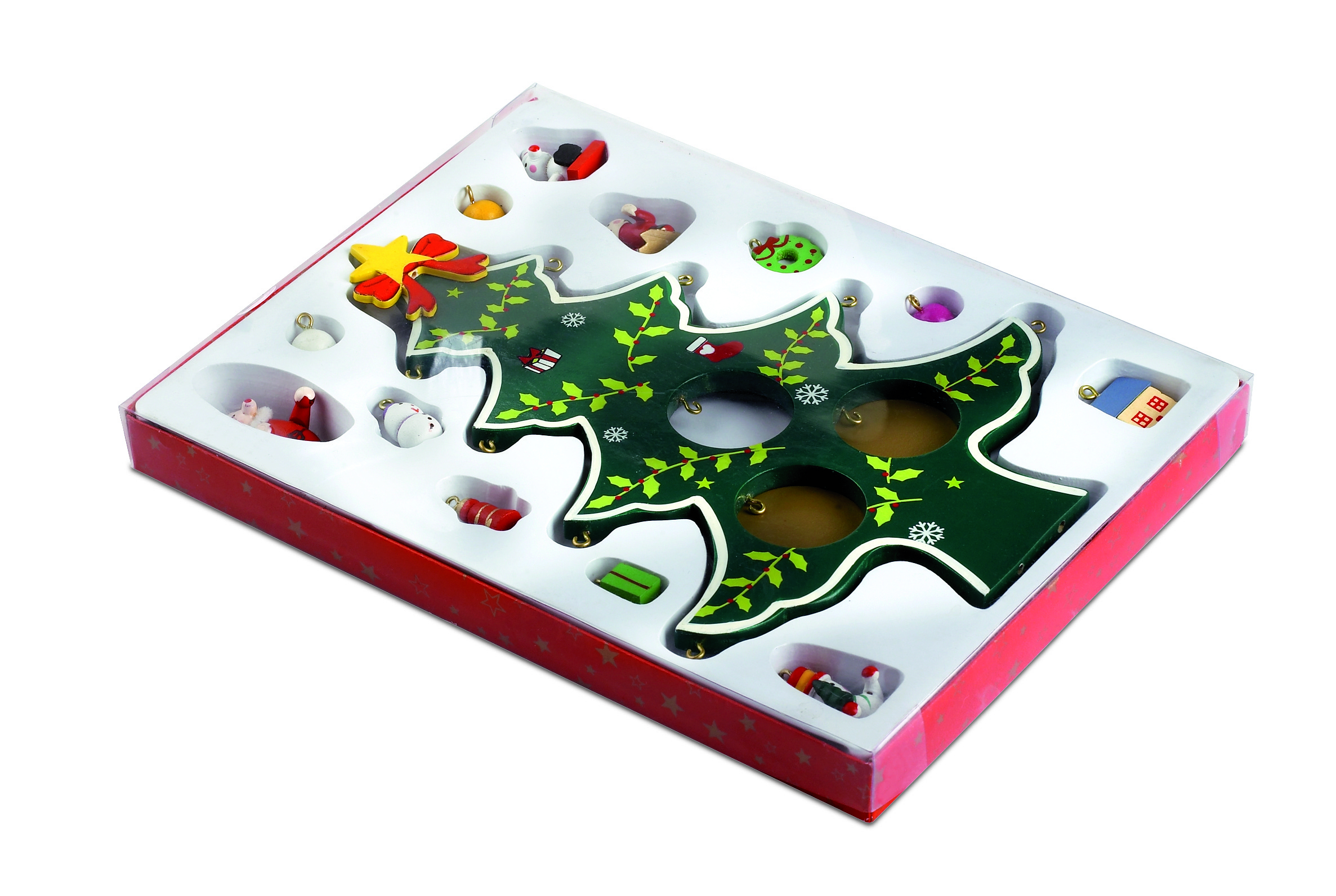 Wooden Christmas tree with 12 assorted tree hanger decorations to be assembled. Individual gift box with transparent cover.